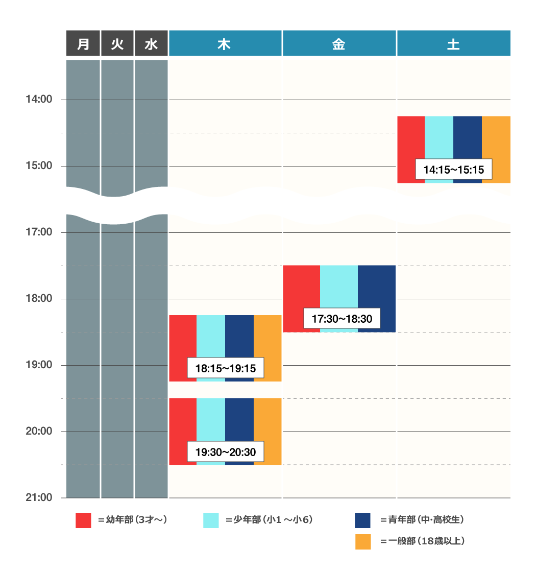| 18:15~19:15 | 幼年部(3才~) 少年部(1年~6年) 青年部(中・高校生) 一般部(18歳以上) |